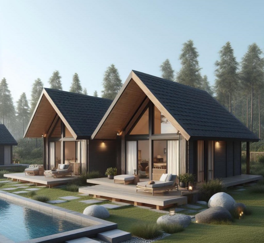 La cabaña Kej, tiene grandes ventanas que permiten el paso de la luz natural, creando un ambiente iluminado y agradable. El metal también refleja la luz y le da un toque de brillo a la cabaña. Este tipo de estructura facilita la ventilación y la circulación del aire, lo que ayuda a mantener una temperatura fresca y cómoda en el interior. El panel de madera es un material que aísla del frío y del ruido, y que transmite sensaciones de bienestar y relajación.